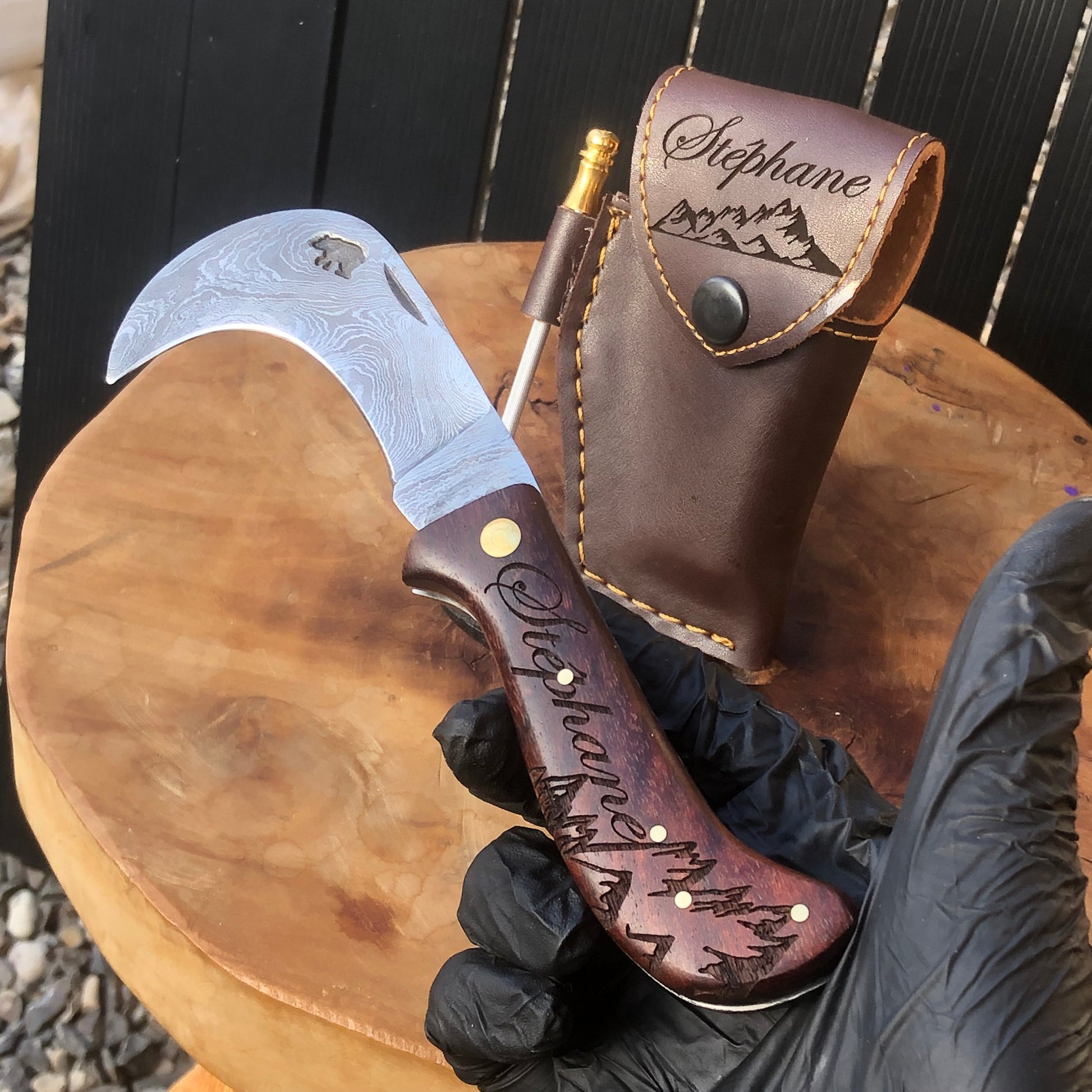 Cette serpette arbore une lame courbe au design traditionnel, inspirée des outils anciens. Forgée en acier de Damas, elle présente de magnifiques motifs ondulés uniques, signature de ce métal noble.