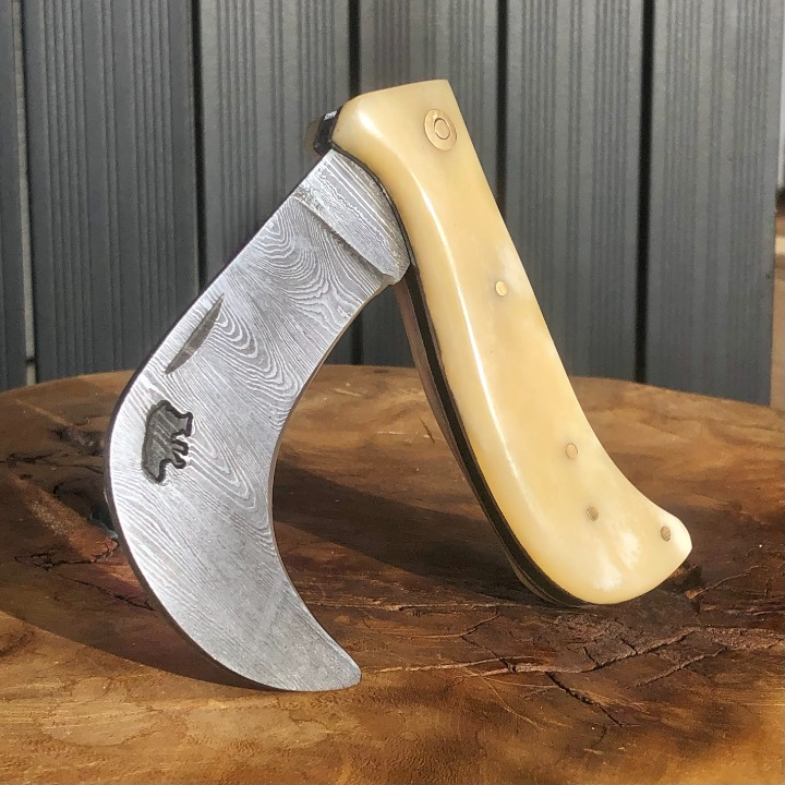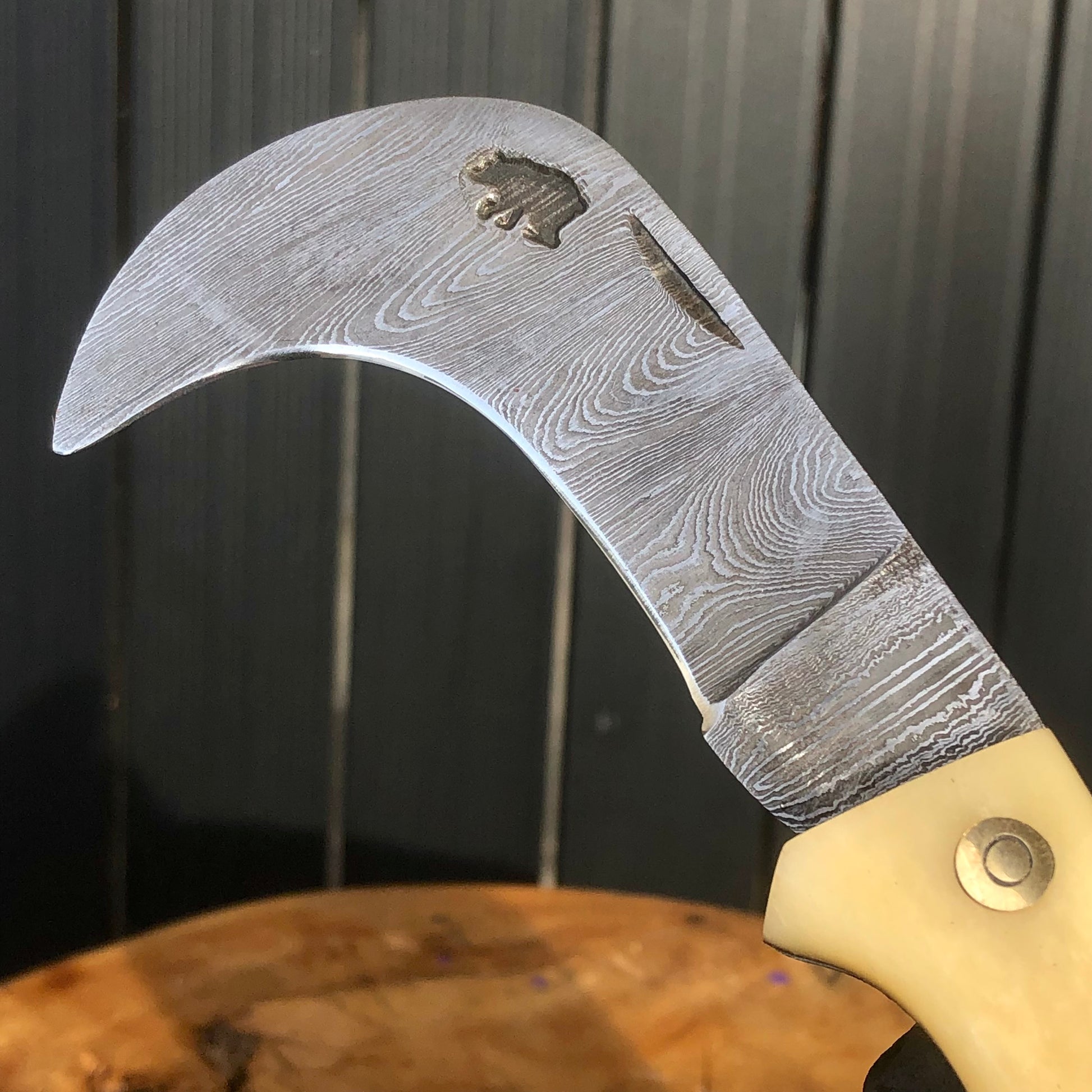 Cette serpette arbore une lame courbe au design traditionnel, inspirée des outils anciens. Forgée en acier de Damas, elle présente de magnifiques motifs ondulés uniques, signature de ce métal noble.