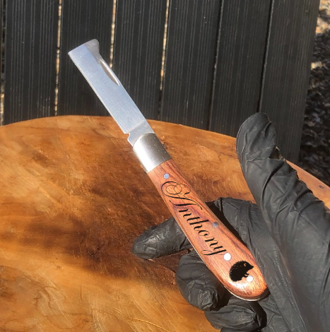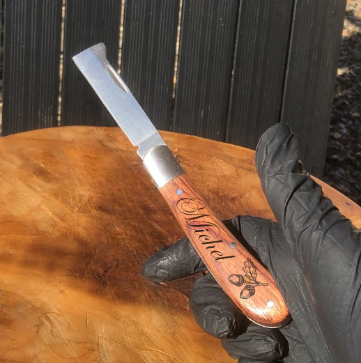 Un cadeau pratique et personnalisé pour un homme de tout âge, avec une gravure unique sur le manche et son étui assorti, gravé du même motif et prénom.