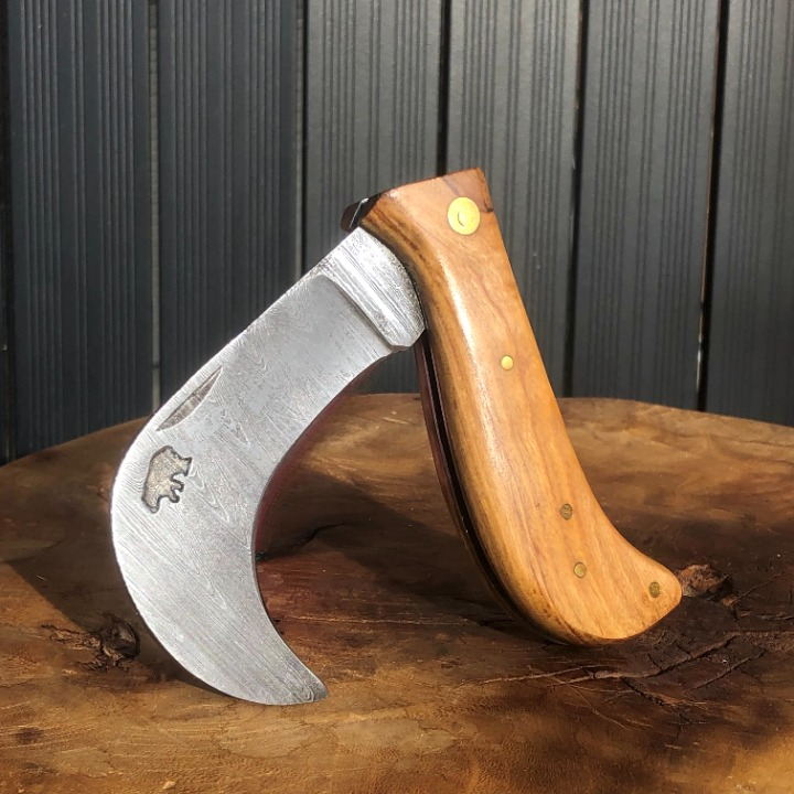 Cette serpette arbore une lame courbe au design traditionnel, inspirée des outils anciens. Forgée en acier de Damas, elle présente de magnifiques motifs ondulés uniques, signature de ce métal noble.