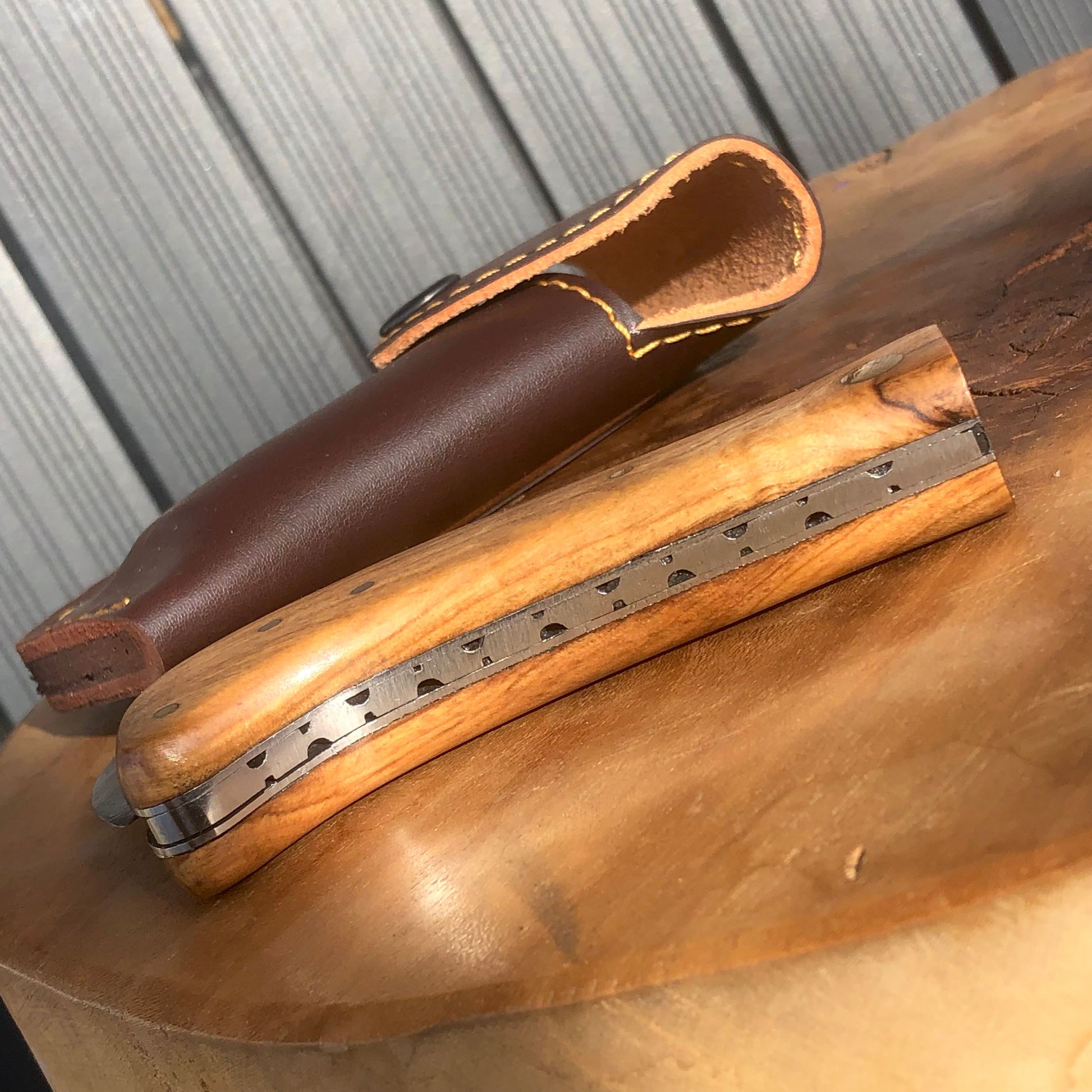 L’ensemble est complété par un étui en croûte de cuir, cousu à la main, qui protège la lame tout en apportant une touche rustique et élégante. Chaque étui est unique, comme la lame qu’il abrite.