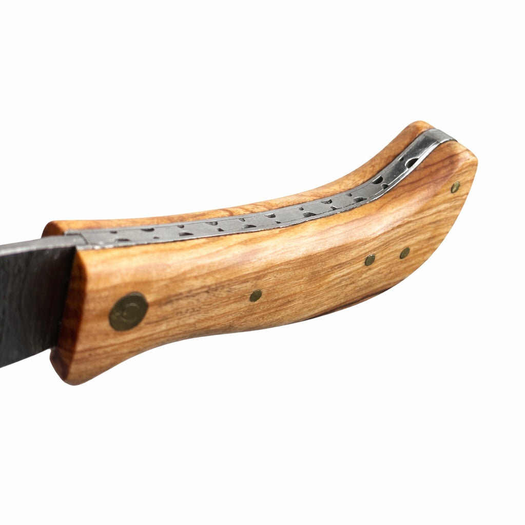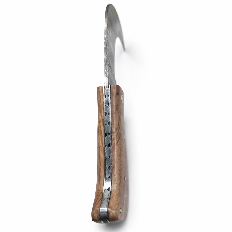 Cette serpette dispose d’une lame forgée en acier damas haut de gamme, composée de 250 couches, offrant :